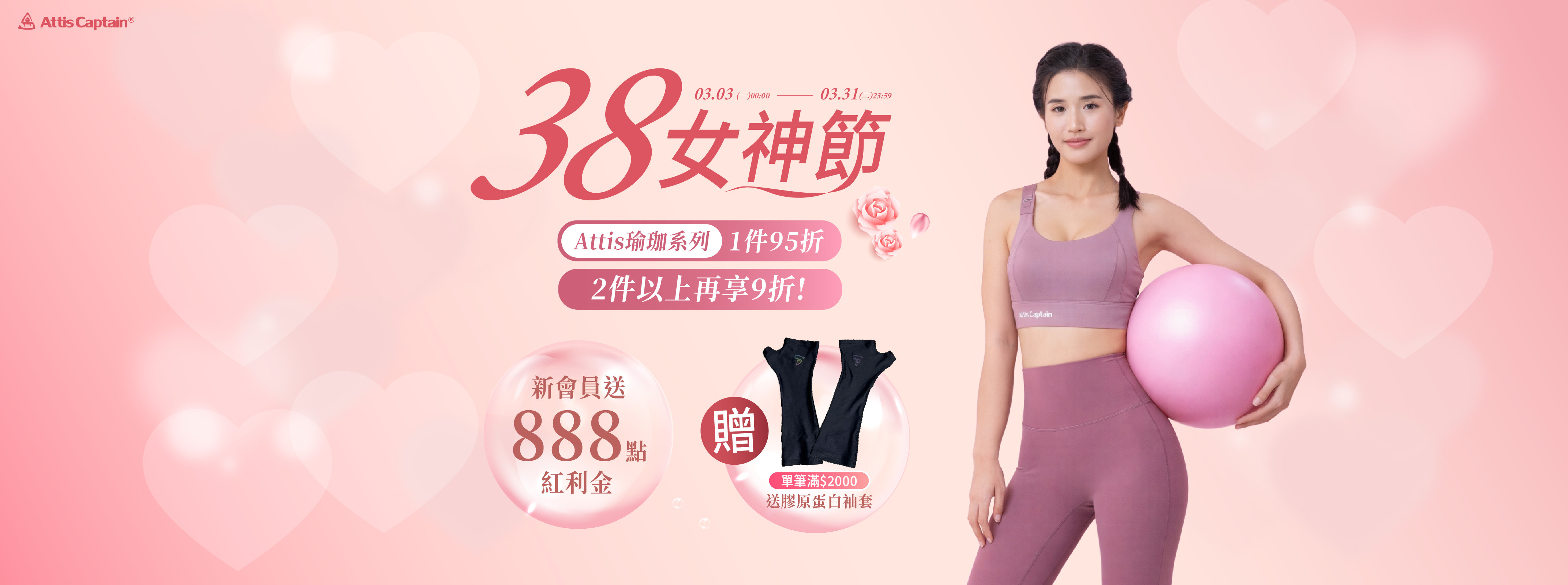03/03~03/31歡慶38女神節瑜珈系列1件95折,2件以上再打9折!